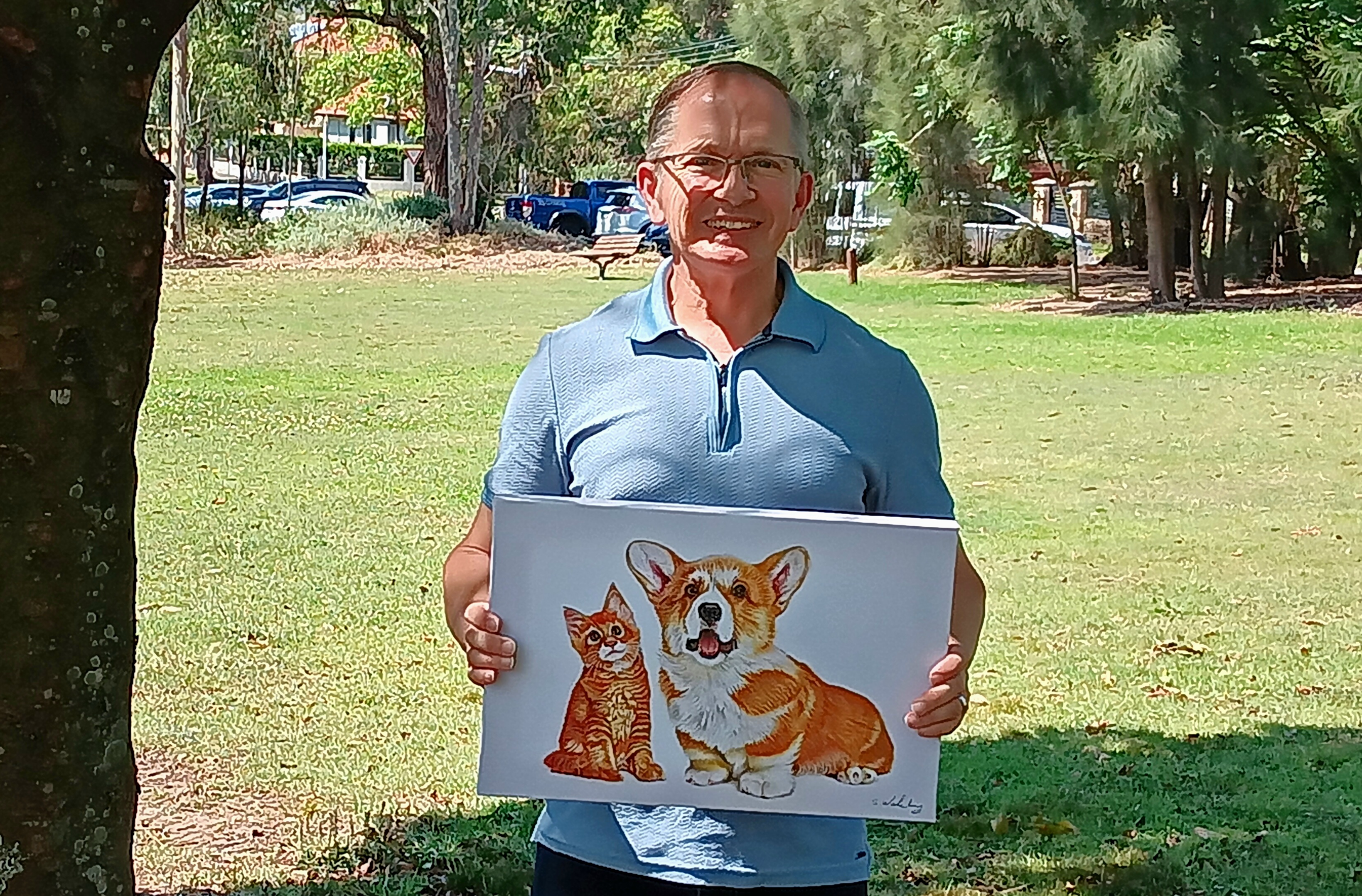 I know that Nigel loves animals; in my spare time I draw and sell my art. I’ve sold some of my work on social media and even had my own exhibition. I came across a cute photograph of a corgi and a cat, which I decided to draw for him. Drawing for people is an expression of my care.